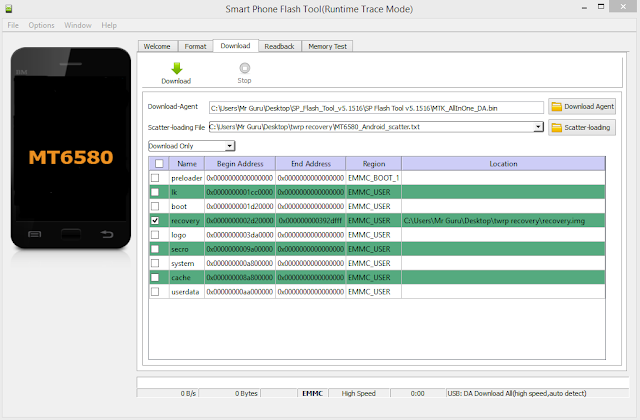 6. After that, input the file, and click on the “download” button. From the below image, you can see I made use of a MT6580 device to run the test, so any MediaTEK device you make use of, it would automatically display.