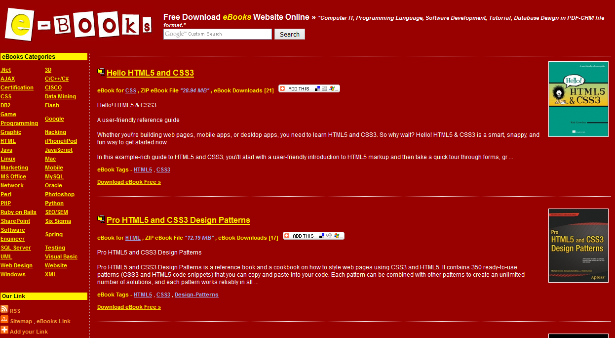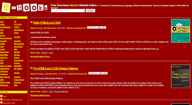 Looking for sites to download free ebooks that deals with tech development and other related programming facts, Ebook-space is best recommended for you. I do get most of my HTML and CSS training ebooks from this website and there are other techy ebooks that you can download from the website.