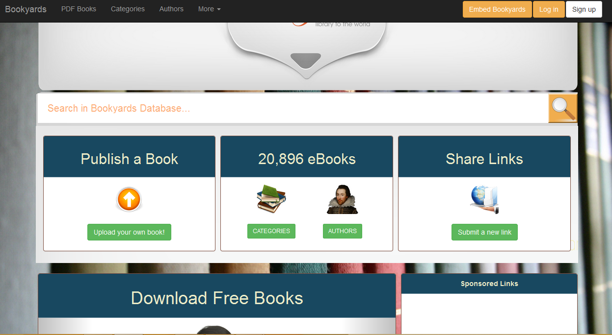 Bookyards lets user upload and publish ebooks and also lets users download ebooks for free. Although they’ve a donation button, so it’s not a must-pay to download any ebook from their website. You can support the site via PayPal donation.